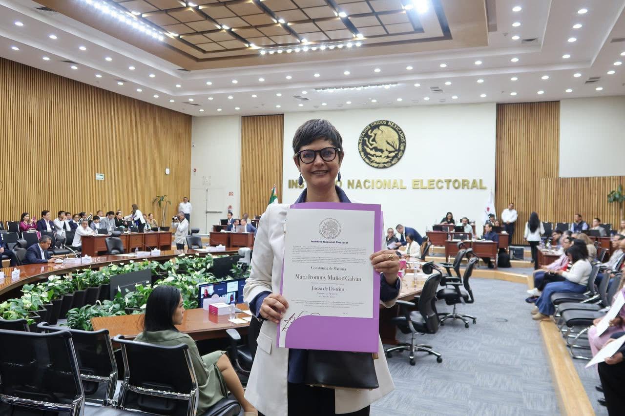 Mara Irommy Muñoz Galván recibió la constancia que la acredita como Jueza de Distrito en materia Penal en Zacatecas, entregada por el Instituto Nacional Electoral (INE).