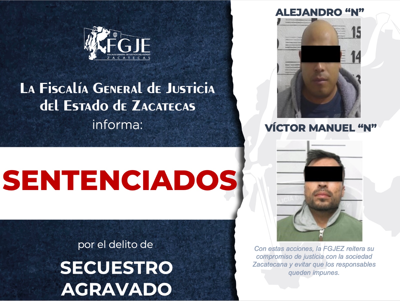 La Fiscalía General de Justicia del Estado de Zacatecas informó que obtuvo una sentencia condenatoria de 80 años de prisión contra Víctor Manuel “N” y Alejandro “N”, tras ser encontrados culpables del delito de secuestro agravado.