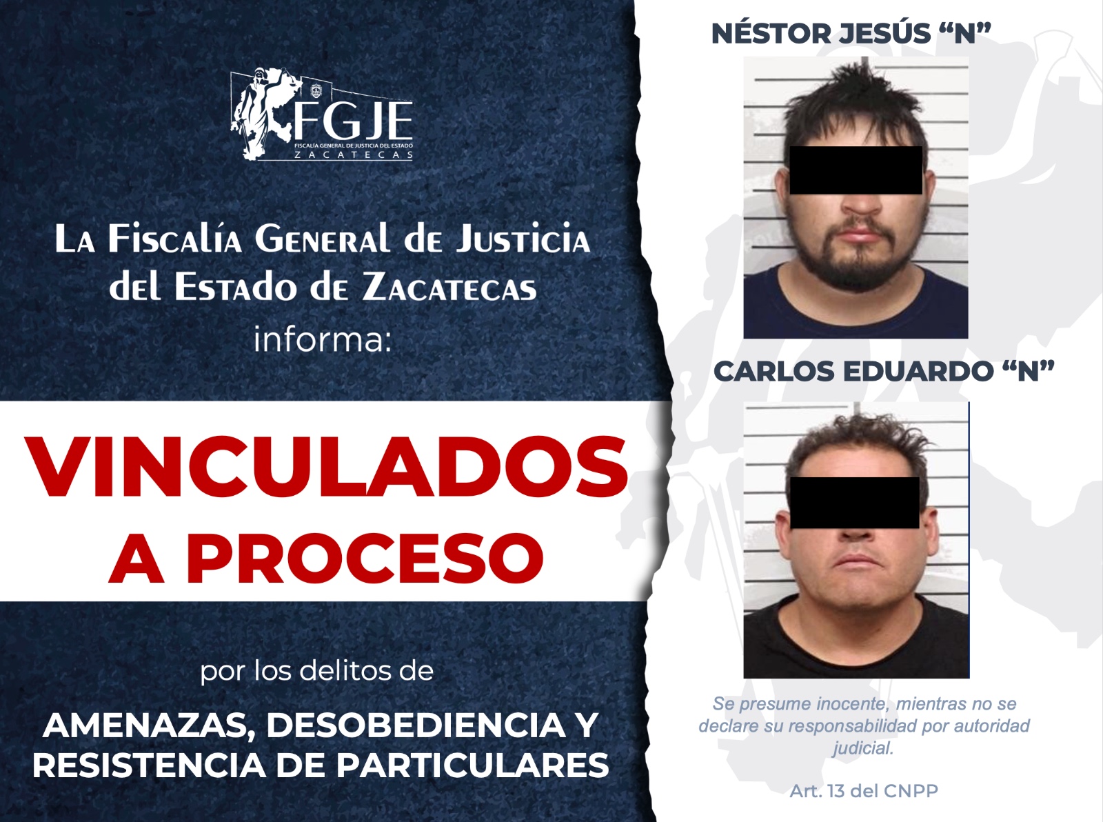 La Fiscalía General de Justicia del Estado (FGJEZ), a través de la Fiscalía Especializada en Delitos de Alto Impacto, consiguió la vinculación a proceso de Néstor “N” y Carlos “N” por los delitos de amenazas, desobediencia y resistencia de particulares.