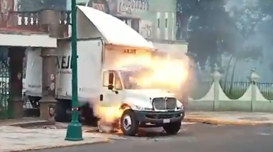 Guerrero. Padres de los 43 estudiantes de Ayotzinapa desaparacidos, acompañados de cientos de normalistas, quemaron un camión frente al Campo militar 1-A y vandalizaron las instalaciones.