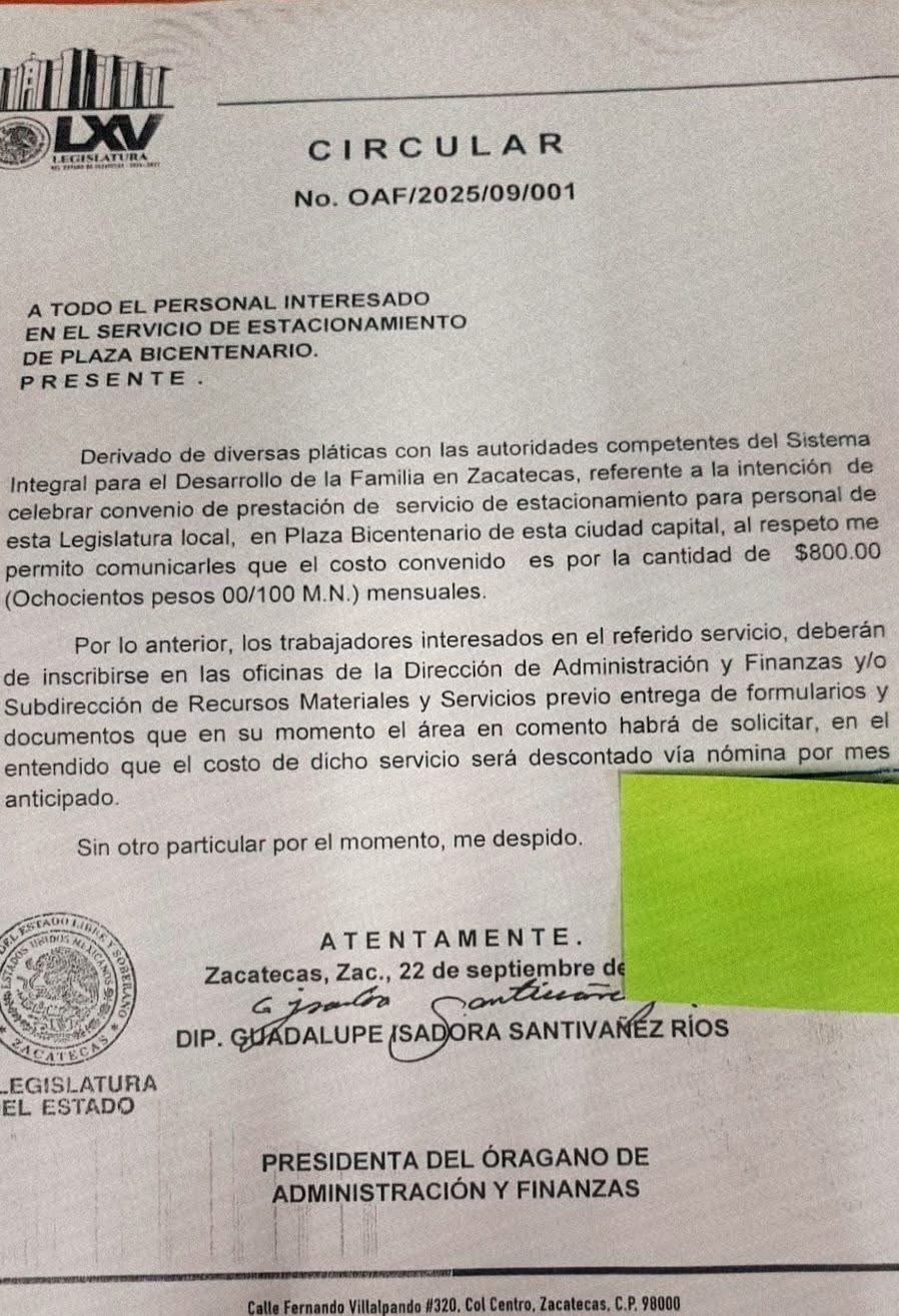 Mientras los diputados de Zacatecas reciben sueldos que rondan los 100 mil pesos mensuales, el “apoyo” que ofrecen a los trabajadores del Congreso se traduce en un convenio para que puedan estacionar su auto en Plaza Bicentenario… pagando $800 mensuales, descontados directamente de su nómina.