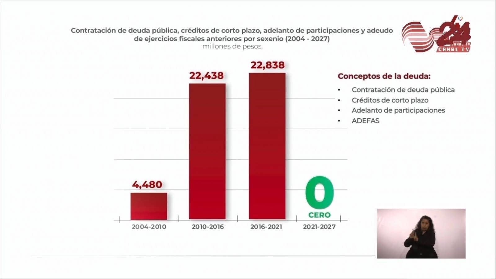 La situación no mejoró en el sexenio 2016-2021, con Alejandro Tello Cristerna, donde la cifra subió ligeramente a 22 mil 838 millones de pesos, consolidando una pesada carga financiera para Zacatecas.