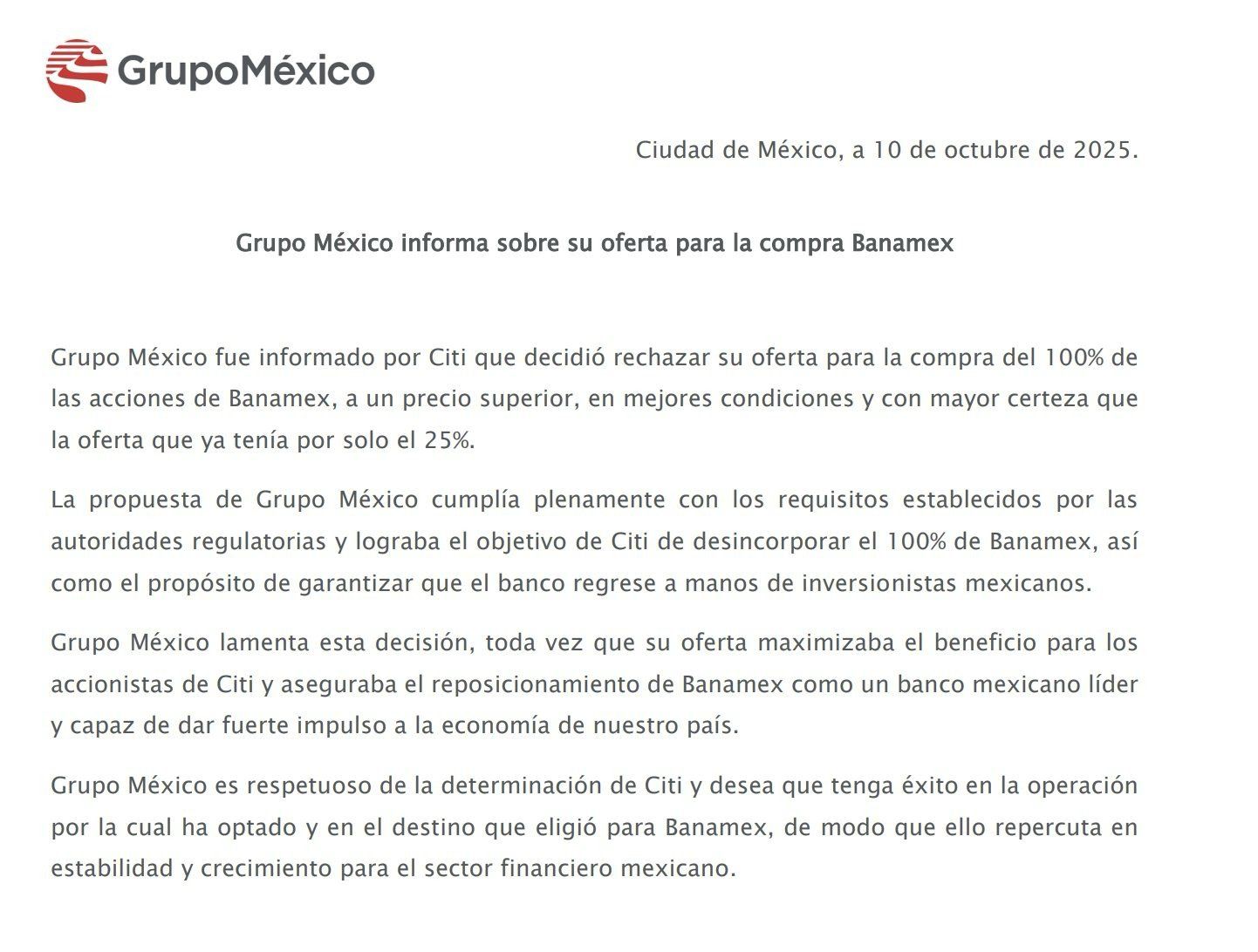 «Después de evaluar cuidadosamente la propuesta, incluyendo sin limitación consideraciones financieras y de certidumbre de la operación, hemos comunicado a Grupo México que Citi rechaza su oferta».