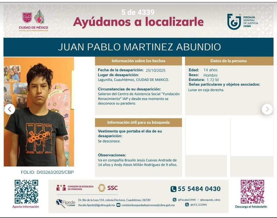La ficha de búsqueda de la Fiscalía General de Justicia de la CDMX indica que Juan Pablo desapareció el 25 de octubre de 2025 en la calle Lagunilla, alcaldía Cuauhtémoc. Portaba 1.72 metros de estatura y un lunar visible en la ceja derecha. Se señala que se encuentra acompañado de Braulio Jesús Cuevas Andrade (14 años) y Andy Alexis Millán Rodríguez (9 años).