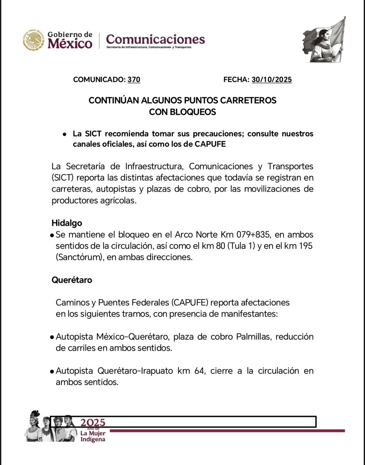 La Secretaría de Infraestructura, Comunicaciones y Transportes (SICT) reportó las distintas afectaciones que todavía se registran en carreteras, autopistas y plazas de cobro, por las movilizaciones de productores agrícolas.
