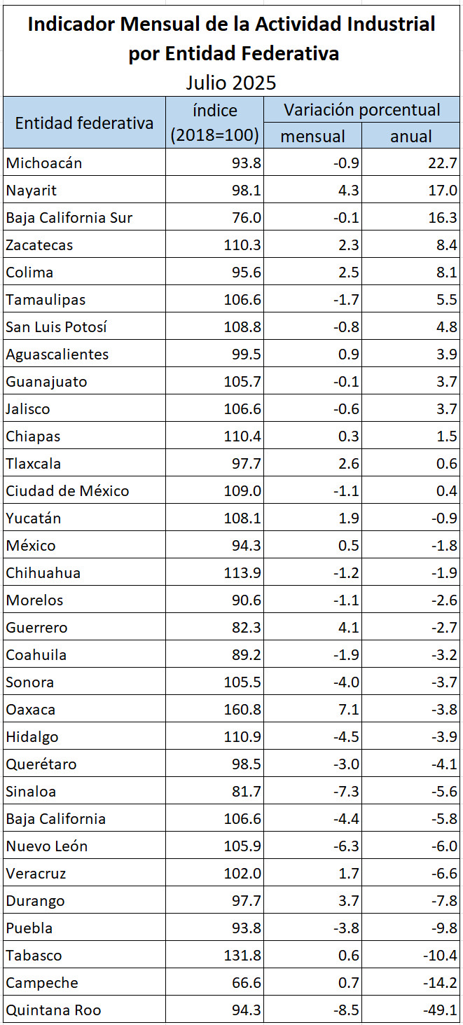 Zacatecas destacó a nivel nacional al colocarse en el cuarto lugar en crecimiento industrial, con una variación positiva del 8.4 %, según datos del Indicador Mensual de la Actividad Industrial por Entidad Federativa (IMAIEF), publicado por el INEGI.