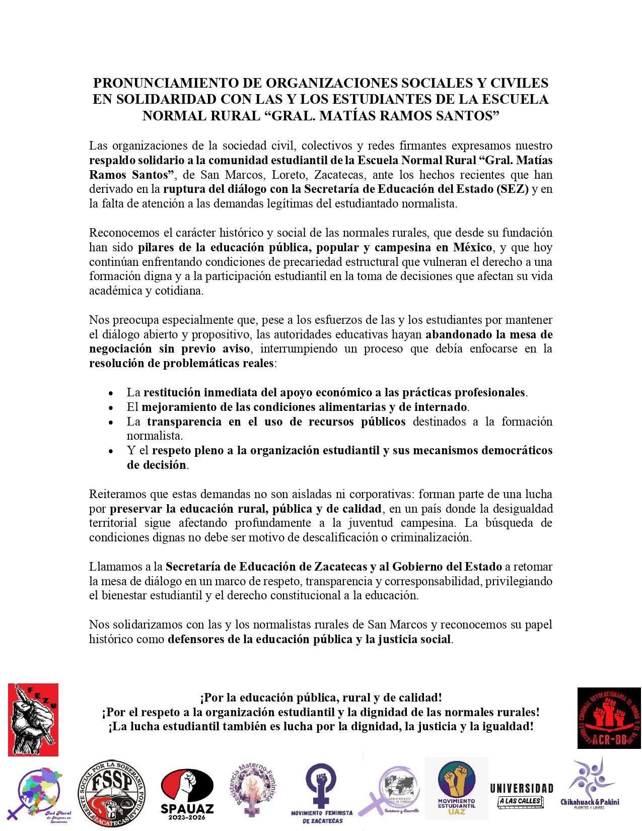 Diversas organizaciones sociales, civiles y redes de apoyo manifestaron su respaldo a los estudiantes de la Escuela Normal Rural “Gral. Matías Ramos Santos”, de San Marcos, Loreto, Zacatecas, tras la ruptura del diálogo con la Secretaría de Educación del Estado (SEZ).