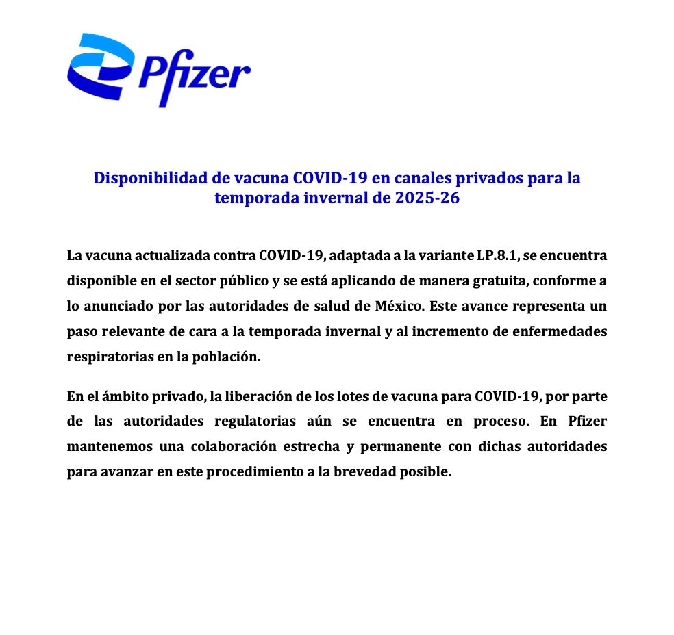 Pfizer emitió un comunicado tras la aclaración de Cofepris y la Secretaría de Salud, pues aunque la vacuna contra la Covid-19 cuenta con autorización para uso en el sector público, aún no está aprobada para su comercialización en el sector privado, ya que el proceso sigue en trámite.