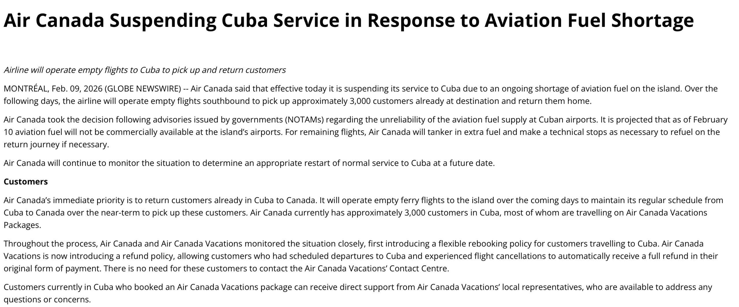 Para repatriarlos, la compañía programó vuelos especiales sin pasajeros en el trayecto de ida, que solo servirán para recoger a los clientes y regresarlos a Canadá.