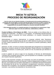 TV Azteca anuncia concurso mercantil voluntario para sanear sus finanzas