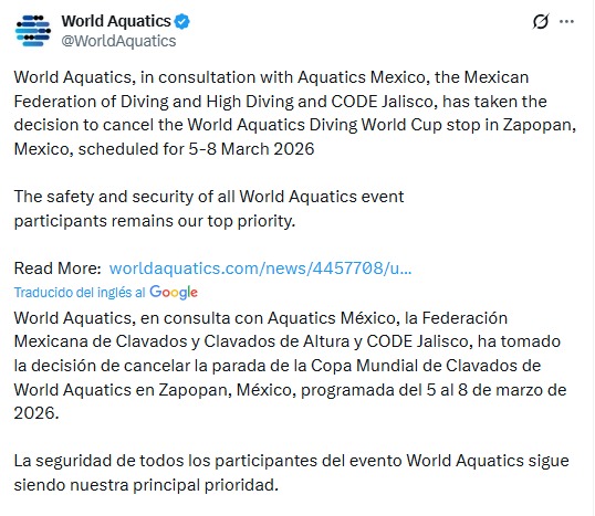 El deporte se vio directamente afectado con la cancelación de la Copa del Mundo de Clavados en Zapopan, un certamen que reuniría a los mejores exponentes de la disciplina y que fue suspendido por decisión de World Aquatics ante el panorama de violencia tras el abatimiento de El Mencho.