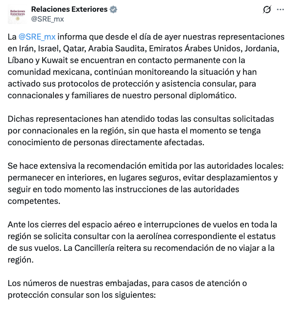 La SRE informó que sus embajadas en Irán, Israel, Qatar, Arabia Saudita, Emiratos Árabes Unidos, Jordania, Líbano y Kuwait mantienen contacto permanente con la comunidad mexicana ante la tensión en la región.