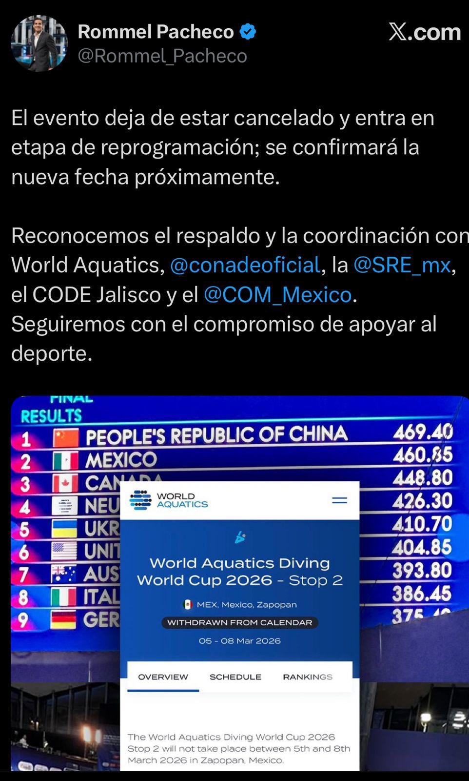 Deportes febrero 28, 2026 Reprograman la Copa del Mundo de Clavados 2026 en México Por Redacción Zacatecas 3.0 0 0 Compartir 0 tweet 0 compartir 0 compartir El titular de la CONADE, Rommel Pacheco, informó que el evento dejó de estar cancelado y entró en fase de reprogramación, por lo que la nueva fecha se confirmará próximamente. Anterior Post SRE activa protocolos en Medio Oriente Próximo Post Cuba condena ataques contra Irán Deja un Comentario Cancelar Respuesta Enviar