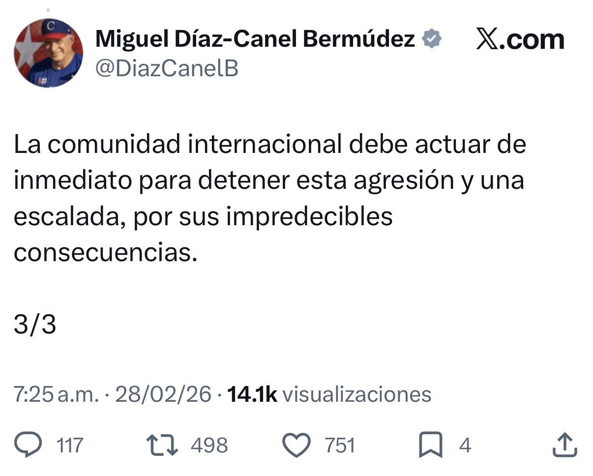 El presidente Miguel Díaz-Canel afirmó que las acciones militares constituyen una “flagrante violación del Derecho Internacional y de la Carta de la ONU”, además de representar un quebranto a la soberanía e integridad territorial iraní.
