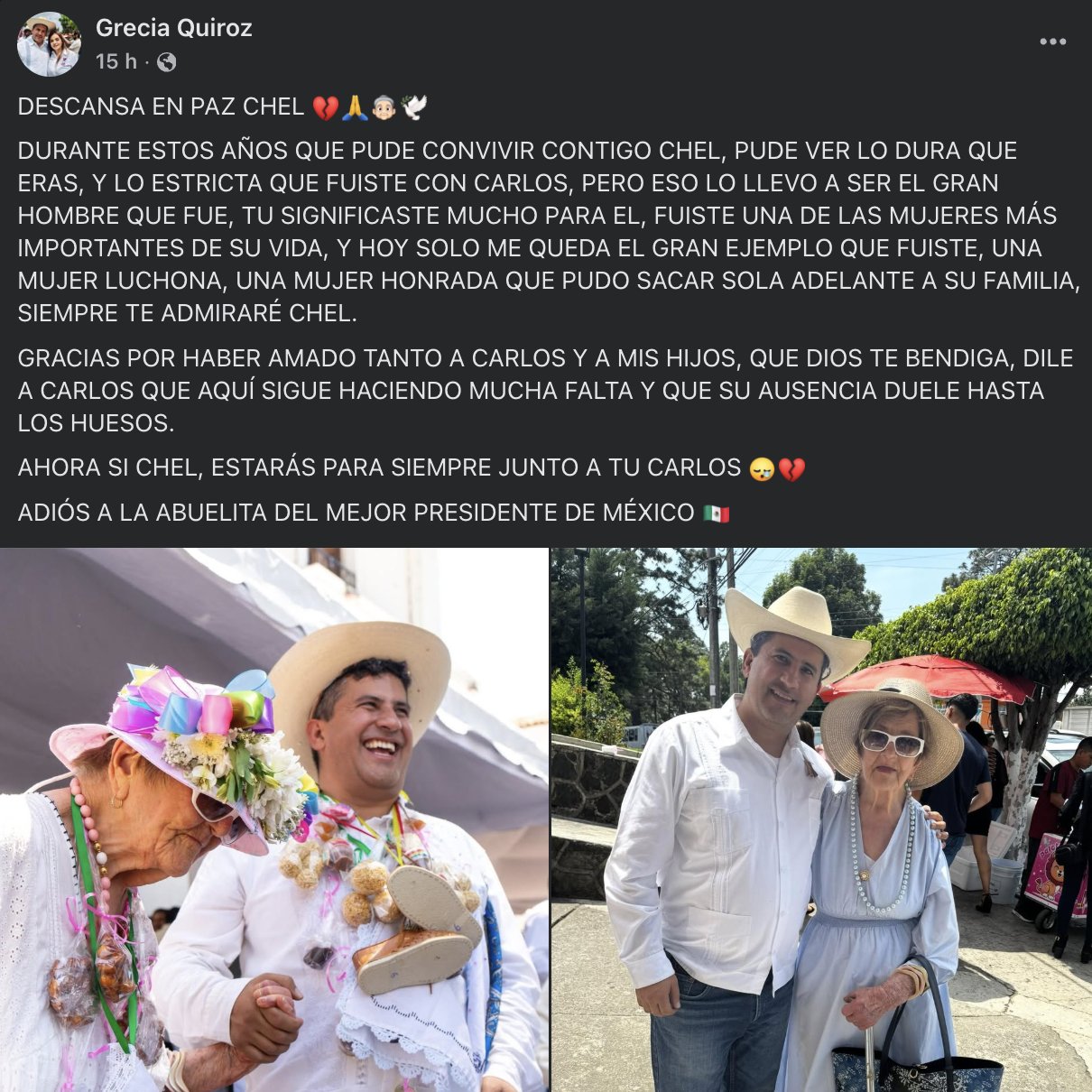 La edil recordó a “Chel” como “una mujer honrada que sacó adelante a su familia”. En su mensaje, también destacó el papel fundamental que tuvo en la vida de Carlos Manzo.