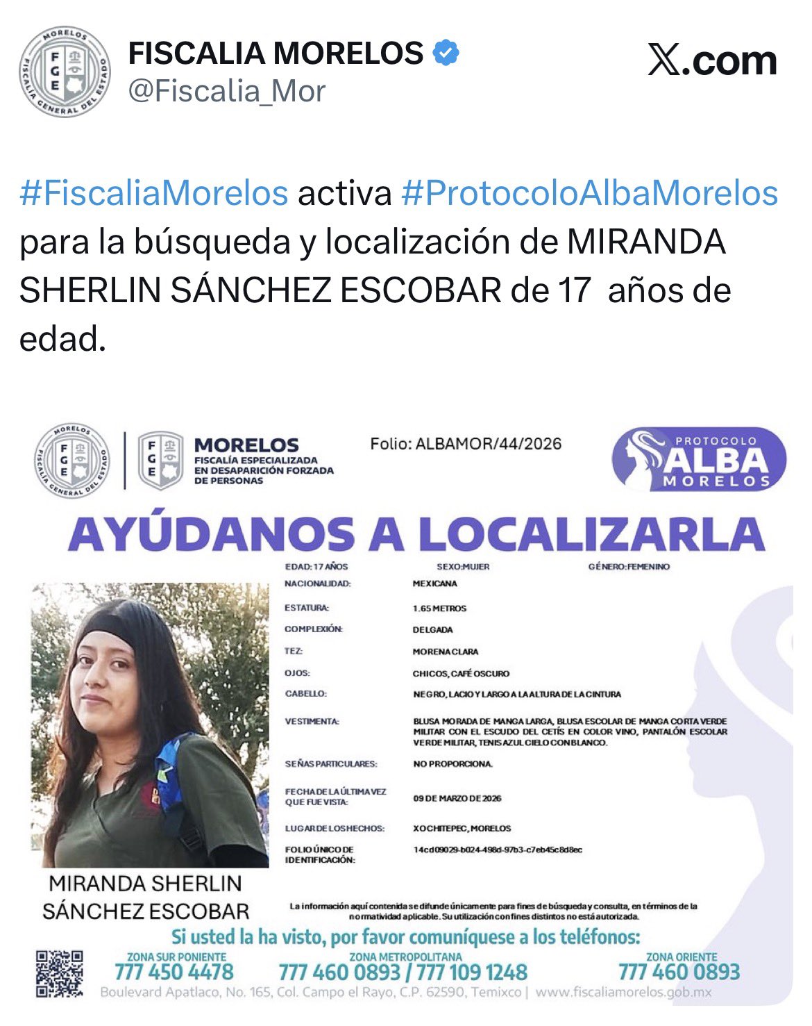 La Fiscalía del Estado de Morelos activó el Protocolo Alba para localizar a Miranda Sherlin Sánchez Escobar, estudiante de 17 años reportada como desaparecida el 9 de marzo.