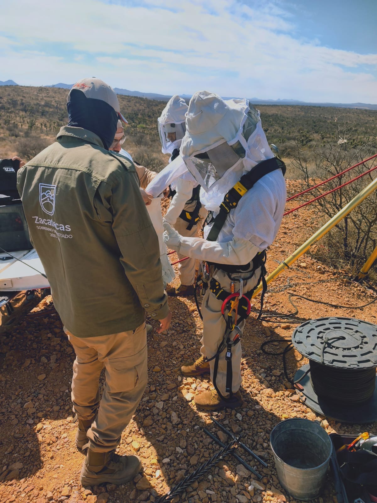 En las inmediaciones de la comunidad de Casa Blanca, elementos de la Coordinación Estatal de Protección Civil realizaron exploraciones al interior de tiros de mina, utilizando técnicas de rapel para descender y revisar estos espacios de difícil acceso.