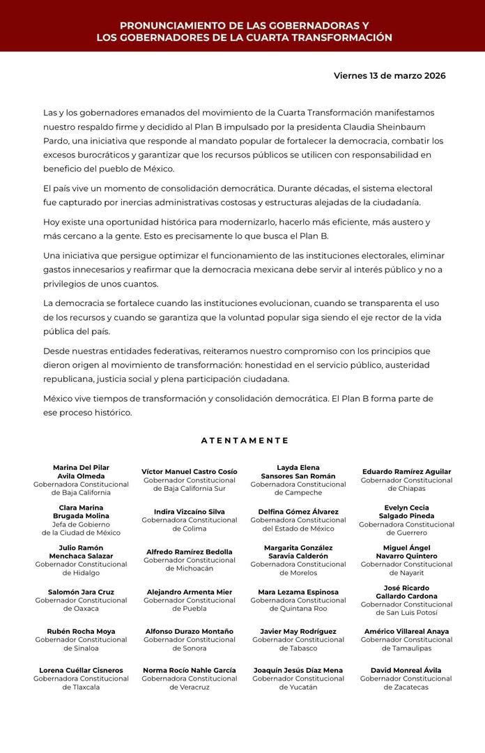 Los gobernadores afines a la 4T emitieron un comunicado en el que respaldaron el plan B de la reforma electoral propuesto por la presidenta Claudia Sheinbaum.