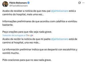 El ex presidente de Brasil, Jair Bolsonaro, fue trasladado a un hospital después de presentar problemas de salud en la madrugada, según informó su hijo, el senador Flávio Bolsonaro. El ex mandatario se encontraba en una penitenciaría de Brasilia tras ser condenado a 27 años de prisión.