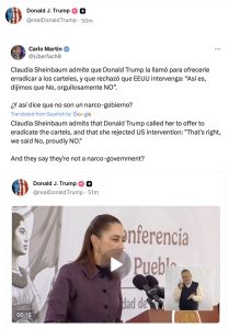 El presidente de Estados Unidos, Donald Trump, compartió en Truth Social una publicación de un usuario identificado como Carlo Martin, quien cuestiona si México es un “narcogobierno”.
