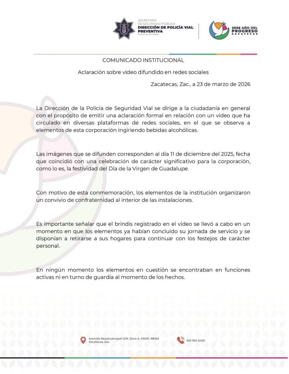 La corporación explicó que el convivio se realizó dentro de sus instalaciones y que el momento captado en el video ocurrió cuando los elementos ya habían concluido su jornada laboral, por lo que no se encontraban en funciones activas ni en turno de servicio.