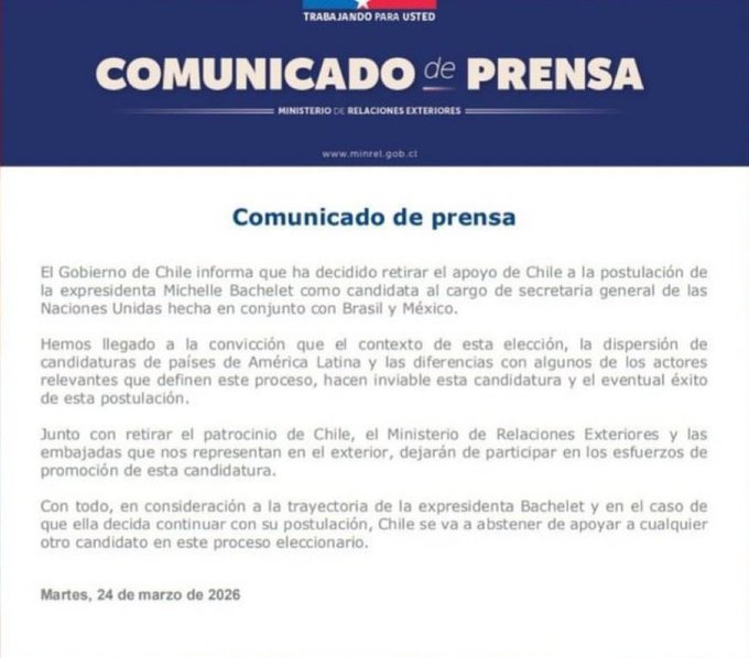 Chile retira apoyo a Michelle Bachelet para dirigir la ONU, candidatura impulsada junto a México y Brasil. El nuevo gobierno encabezado por José Antonio Kast anunció este martes que ya no respaldará la postulación de la ex presidenta chilena.