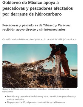 La Conapesca informó que el Gobierno de México apoyará a 3 mil 679 pescadores afectados por el derrame de hidrocarburo en el Golfo de México. Cada persona recibirá 15 mil pesos de forma directa, a través de la Tarjeta Bienestar.