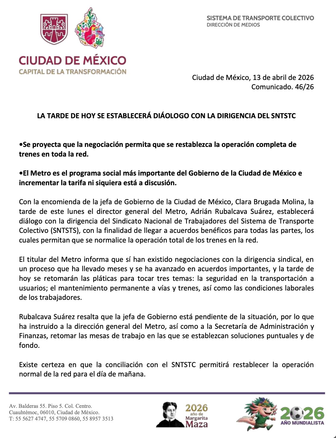 El director del Metro, Adrián Rubalcava, retomará este lunes las negociaciones con el sindicato para alcanzar acuerdos. Entre los temas a tratar están la seguridad de usuarios, mantenimiento de trenes y vías, y condiciones laborales del personal.