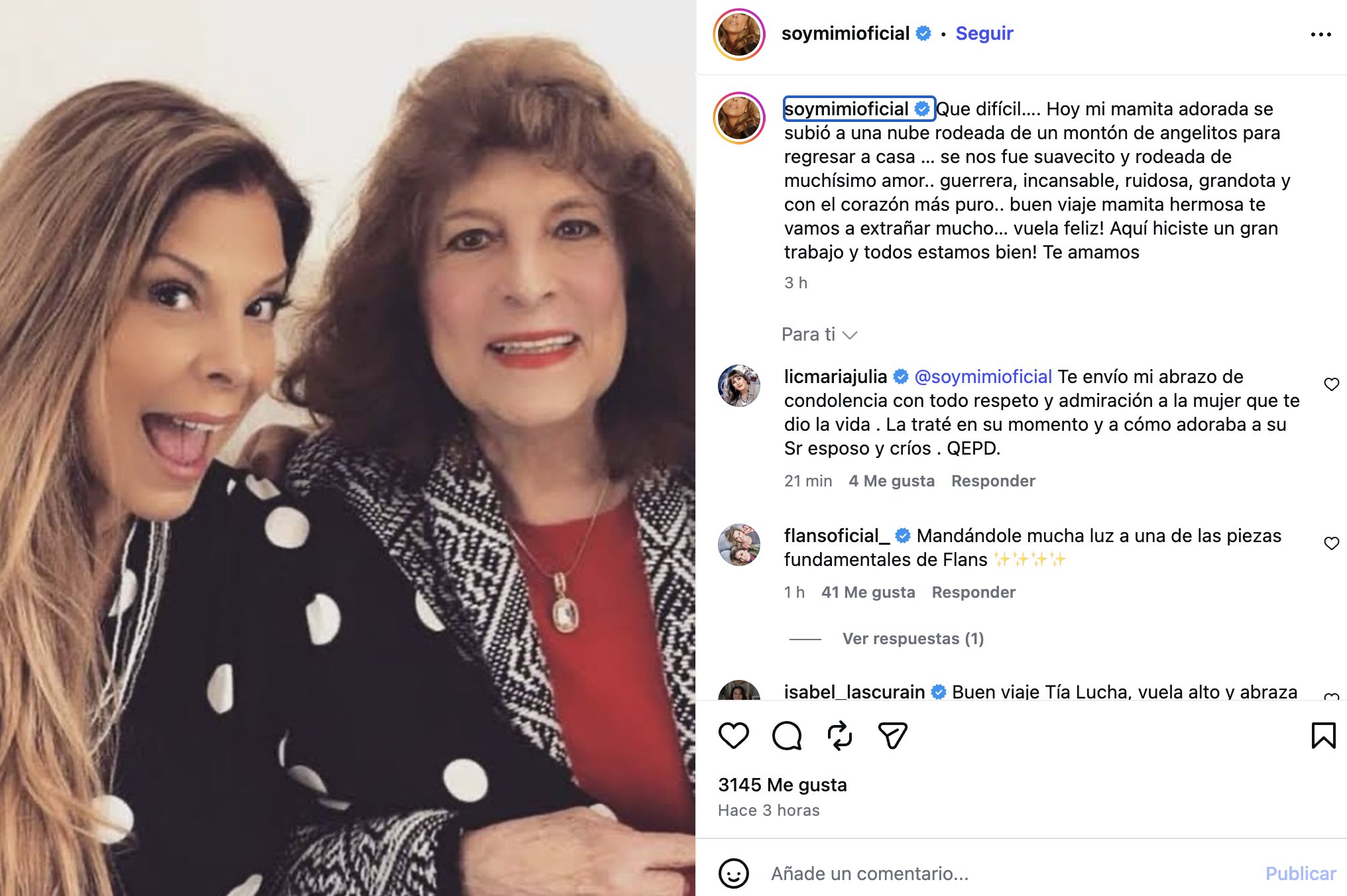 “Qué difícil… Hoy mi mamita adorada se subió a una nube rodeada de un montón de angelitos para regresar a casa… se nos fue suavecito y rodeada de muchísimo amor… guerrera, incansable, ruidosa, grandota y con el corazón más puro… buen viaje mamita hermosa te vamos a extrañar mucho… vuela feliz! Aquí hiciste un gran trabajo y todos estamos bien! Te amamos”, escribió.