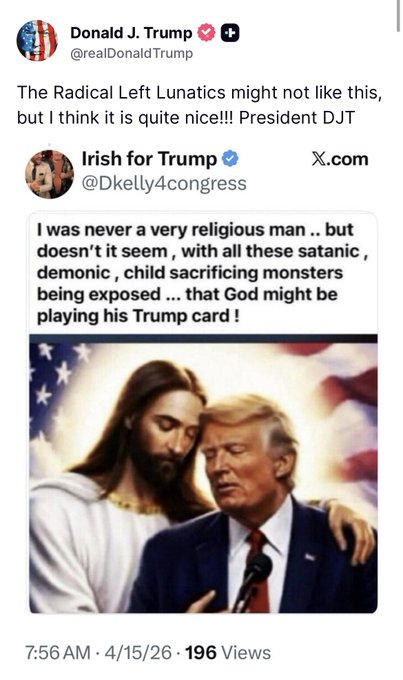 El mandatario estadounidense, Donald Trump, compartió una vez más una imagen en la que se le ve, ahora, abrazado por Jesús. “Puede que a los lunáticos de la izquierda radical no les guste esto, ¡pero creo que es bastante agradable!”, escribió.