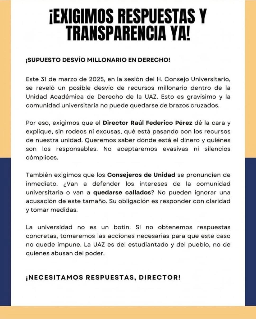 Los manifestantes han pedido que el director Raúl Federico Pérez aclare el destino de los recursos y han instado a los Consejeros de Unidad a pronunciarse con firmeza. Argumentan que la universidad no es un botín y advierten que, si no hay respuestas concretas, tomarán medidas para que este caso no quede impune.