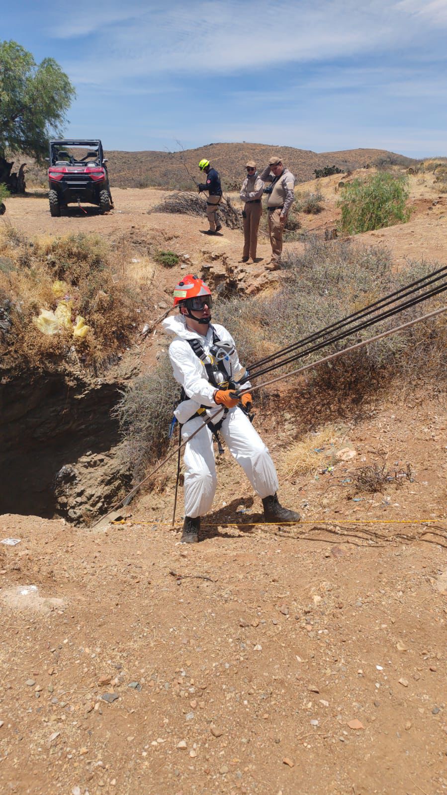 Elementos especializados descendieron a rapel al fondo del tiro para realizar inspecciones y posibles hallazgos. La intervención también incluyó apoyo de Protección Civil y unidades forenses.