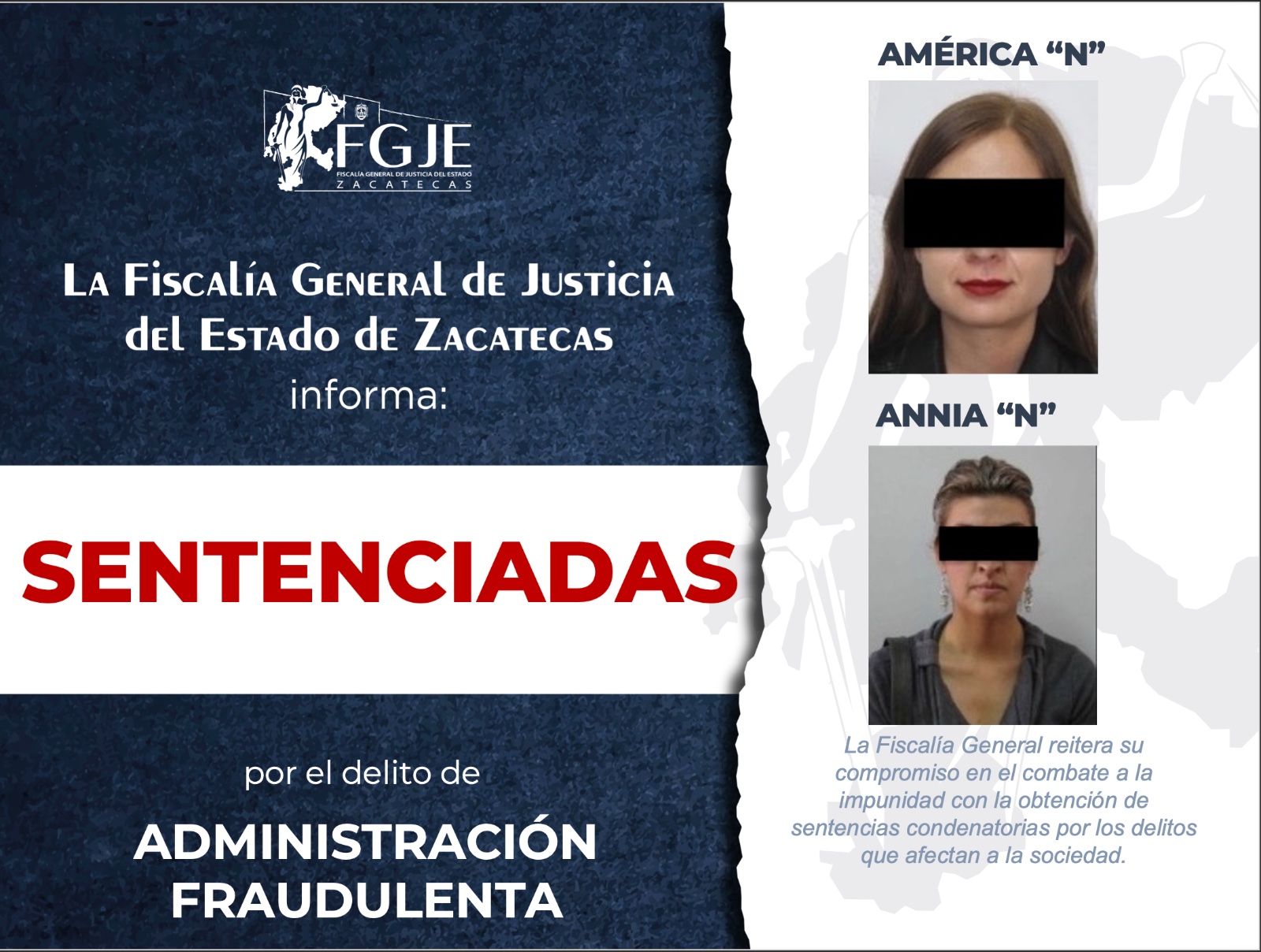 La Fiscalía General de Justicia del Estado de Zacatecas logró una victoria judicial al conseguir una condena de cinco años de prisión contra Annia “N”, declarada autora material del ilícito, y América “N”, sentenciada como partícipe cómplice, por el delito de administración fraudulenta.