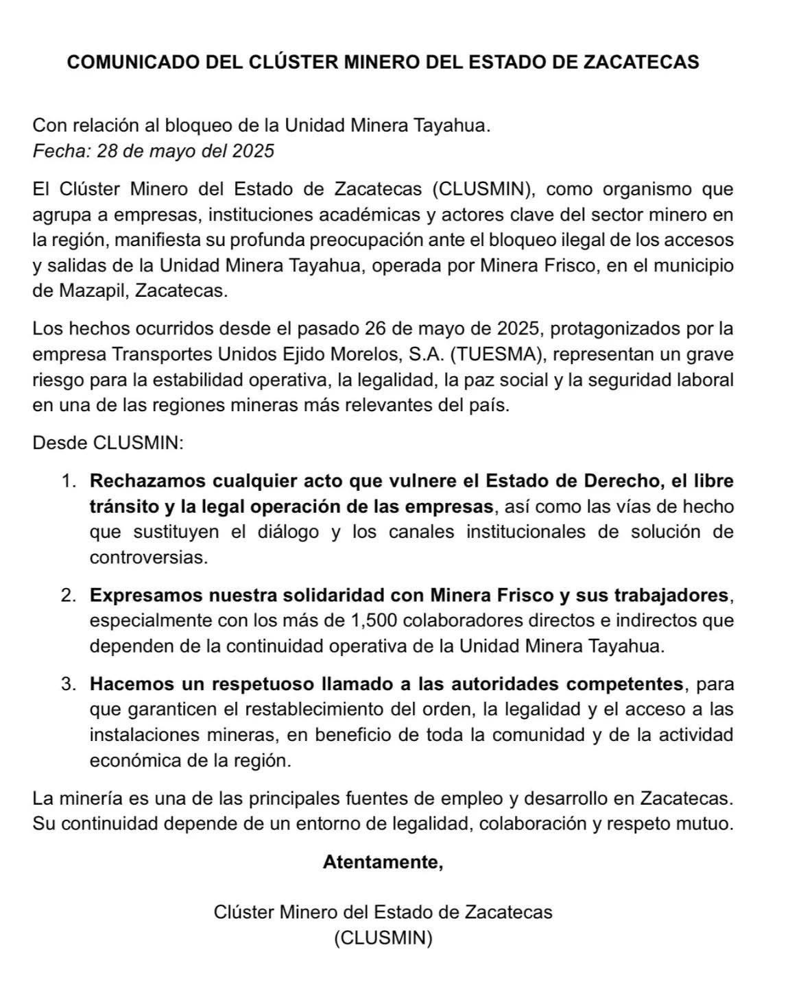 CLUSMIN expresó su solidaridad con los más de 1,500 trabajadores directos e indirectos que dependen de la operación de la Unidad Minera Tayahua, al tiempo que destacó la relevancia de la minería como fuente de empleo y desarrollo económico en Zacatecas.