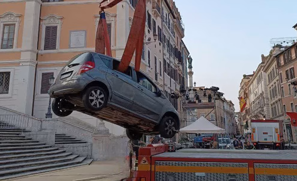 Anciano queda atascado con su auto en la Escalinata de Plaza de España en Roma