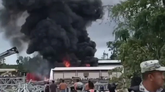 Felipe Carrillo Puerto, Q. Roo. – Un incendio de gran magnitud se registró este jueves en un campamento de ingenieros militares que participan en la construcción del Tren Maya, en el tramo 6 de la obra federal. El fuego, que fue provocado tras la explosión de una pipa de combustible, generó una densa columna de humo visible a varios kilómetros de distancia.