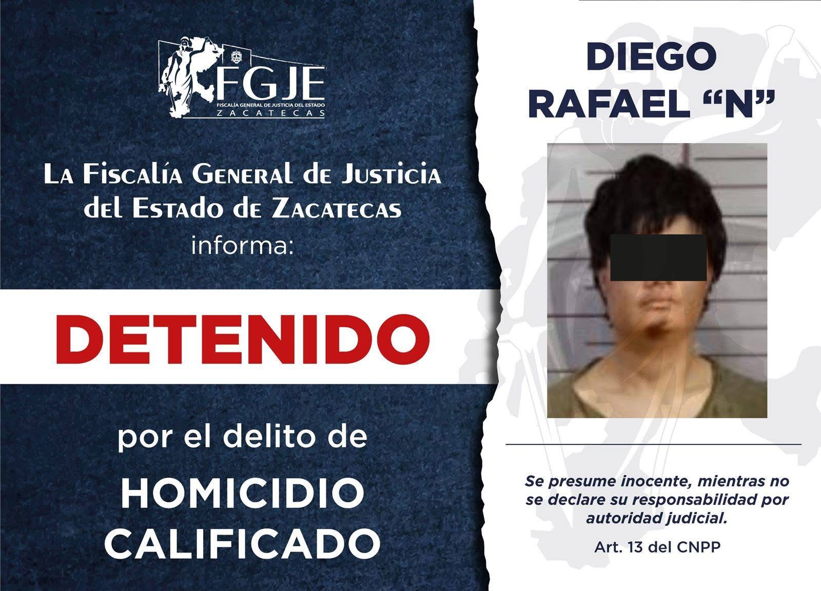 De acuerdo con la Fiscalía General de Justicia del Estado de Zacatecas (FGJE), en coordinación con la Mesa Estatal de Construcción de Paz y Seguridad, se cumplimentaron órdenes de aprehensión contra dos personas: Diego Rafael “N”, vinculado al homicidio de “Chonito”, y Alfredo “N”, detenido con apoyo de la Fiscalía de Durango por delitos de amenazas y asociación delictuosa.
